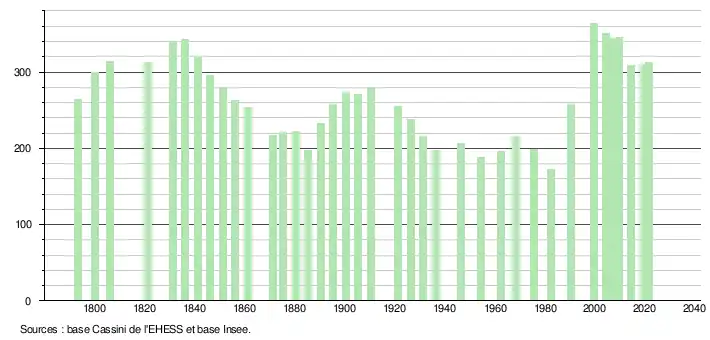 L'évolution du nombre d'habitants est connue à travers les recensements de la population effectués dans la commune depuis 1793. Pour les communes de moins de 10 000 habitants, une enquête de recensement portant sur toute la population est réalisée tous les cinq ans, les populations légales des années intermédiaires étant quant à elles estimées par interpolation ou extrapolation[19]. Pour la commune, le premier recensement exhaustif entrant dans le cadre du nouveau dispositif a été réalisé en 2004[20].