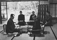 Yasuharu Ōyama (à gauche) contre Yoshio Kimura en 1952 sous le regard de Yasuhito Chichibu.