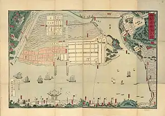 Un document historique d'Asuka-kyō, une des capitales impériales du Japon au cours de la période Asuka (538 - 710), mentionne un hameau dans le district de Kuraki[l 4] de la province de Musashi : le hameau Moruoka[l 5],[6]. Selon le Man'yōshū, une anthologie de poésie japonaise du VIIIe siècle, le développement urbain s'organise alors dans les districts de Kuraki et de Tsuzuki[l 6]. Le commerce et l'artisanat s'intensifient durant l'époque de Kamakura (1185 – 1333)[6]. À l'époque d'Edo (1603 - 1868), plus de vingt villages de pêcheurs et d'agriculteurs prospèrent le long de la côte et dans les terres. Au début du XVIIe siècle, les relais Kanagawa-juku et Hodogaya-juku (1601) puis Totsuka-juku (1604) sont créés le long du Tōkaidō, un axe routier reliant Edo, Kyoto, Osaka et Kobe[2],[6]. Ils deviennent des centres économiques et culturels importants de la région[6]. En 1721, émerge le domaine féodal de Mutsuura[6]. Au milieu du XIXe siècle, le traité de Kanagawa (1854) et le traité d'Amitié et de Commerce (1858), signés entre les États-Unis et le Japon, ouvrent le pays aux étrangers après une longue période d'isolationnisme. En 1859, le bourg de Yokohama [l 7] prend son essor grâce à l'ouverture de son port, qui s'intègre rapidement au commerce maritime international[7],[2]. Il est découpé en six quartiers et comprend une concession pour les étrangers[8]. Trente ans plus tard, après l'officialisation par le gouvernement de Meiji du découpage du territoire national en préfectures (la préfecture de Kanagawa est créée officiellement en 1876[9])[10], le bourg de Yokohama acquiert le statut de ville. En 1889, la ville de Yokohama rassemble 116 193 habitants (25 849 foyers), répartis sur une superficie de 5,40 km2[6],[11]. En 1901, par l'intégration de localités voisines, la ville s'étend sur 24,80 km2 puis sur 36,72 km2 dix ans plus tard — sa population atteint alors 444 039 habitants[11].