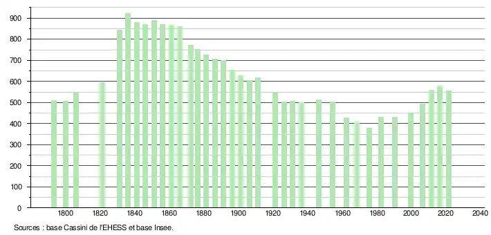 L'évolution du nombre d'habitants est connue à travers les recensements de la population effectués dans la commune depuis 1793. Pour les communes de moins de 10 000 habitants, une enquête de recensement portant sur toute la population est réalisée tous les cinq ans, les populations légales des années intermédiaires étant quant à elles estimées par interpolation ou extrapolation[30]. Pour la commune, le premier recensement exhaustif entrant dans le cadre du nouveau dispositif a été réalisé en 2006[31].