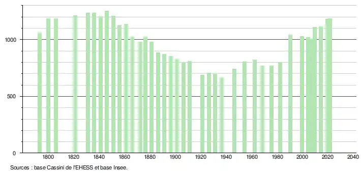 L'évolution du nombre d'habitants est connue à travers les recensements de la population effectués dans la commune depuis 1793. Pour les communes de moins de 10 000 habitants, une enquête de recensement portant sur toute la population est réalisée tous les cinq ans, les populations légales des années intermédiaires étant quant à elles estimées par interpolation ou extrapolation[30]. Pour la commune, le premier recensement exhaustif entrant dans le cadre du nouveau dispositif a été réalisé en 2004[31].
