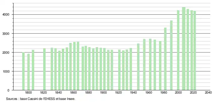 L'évolution du nombre d'habitants est connue à travers les recensements de la population effectués dans la commune depuis 1793. Pour les communes de moins de 10 000 habitants, une enquête de recensement portant sur toute la population est réalisée tous les cinq ans, les populations légales des années intermédiaires étant quant à elles estimées par interpolation ou extrapolation[28]. Pour la commune, le premier recensement exhaustif entrant dans le cadre du nouveau dispositif a été réalisé en 2007[29].