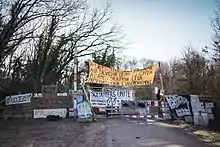 Le , une militante zadiste anonyme dépose plainte contre la police cantonale vaudoise, pour « voies de fait, abus d’autorité et tentative de dénonciation calomnieuse »[36]. Cette militante précise qu'elle avait négocié sa présence avec des officiers de police en tant que « soutien au sol » dans le but d'assurer la sécurité des personnes suspendues en l'air et d'informer la police. Selon son avocat, son arrestation le aurait été illicite[37].