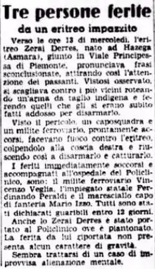 Selon d'autres sources, Zerai a tué au moins cinq personnes et en a blessé d'autres, en criant des mots tels que "Le Lion de Judah est vengé!" avant d'être arrêté ou tué par les fascistes sur place dans une grêle de coups de feu.