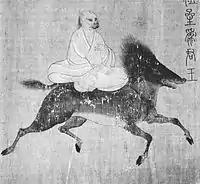 On raconte aussi qu'un jour, ayant peint quatre dragons sur les murs d'un temple, il ne leur marque pas la prunelle, non par négligence mais par prudence; personne, cependant ne voulant tenir compte de ses avertissements, il pointe donc l'œil de deux dragons, qui aussitôt s'enfuient vers le ciel à cheval sur des nuages dans le fracas du tonnerre, car en marquant la prunelle de ses dragons, il leur ouvre les yeux et leur donne la vie, prenant, ce faisant, l'ascendant sur l'être qu'il figure. L'esprit étant fugace, omniprésent, qui peut le saisir et le fixer dans une peinture confère à son œuvre un étrange pouvoir de suggestion[5].