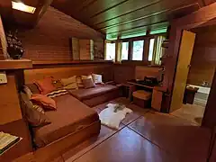 Elle est construite sur un vaste terrain arboré, avec de vastes baies vitrées, des murs en béton, brique, et en panneau de bois de Cyprès, avec une terrasse, et 2 chambres à l'étage. Elle est organisée autour d'une grande cheminée centrale en forme de L, avec de nombreux meubles intégrés.