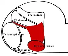 Peu de temps après le début de la structuration dorso- ventrale, Shh s'exprime le long de la plaque basale (le bas) de l'embryon, qui fonctionne dans « la ventralisation du tube neural, la promotion de la croissance et de la prolifération, et la formation de l'hypothalamus »[9]. Au fur et à mesure que l'embryon continue de se développer, l' expression Shh caractéristique de la ZLI s'étend dorsalement pour former un coin qui se rétrécit finalement en une bande à environ 22 somites (le nombre de rhombomères développés) ou moins d'un jour chez le poisson zèbre. Bien que l'expression de Shh s'étende dorsalement à partir de la plaque basale, la ZLI est capable de se former même sans la plaque basale ou le tissu mésodermique. Shh coopère avec <i id="mwqQ">dlx2</i> et fezl en avant et IRX3 et dbx1a en arrière (les gènes exprimés varient selon les organismes), qui sont des gènes exprimés dans le préthalamus et le thalamus, respectivement[10].